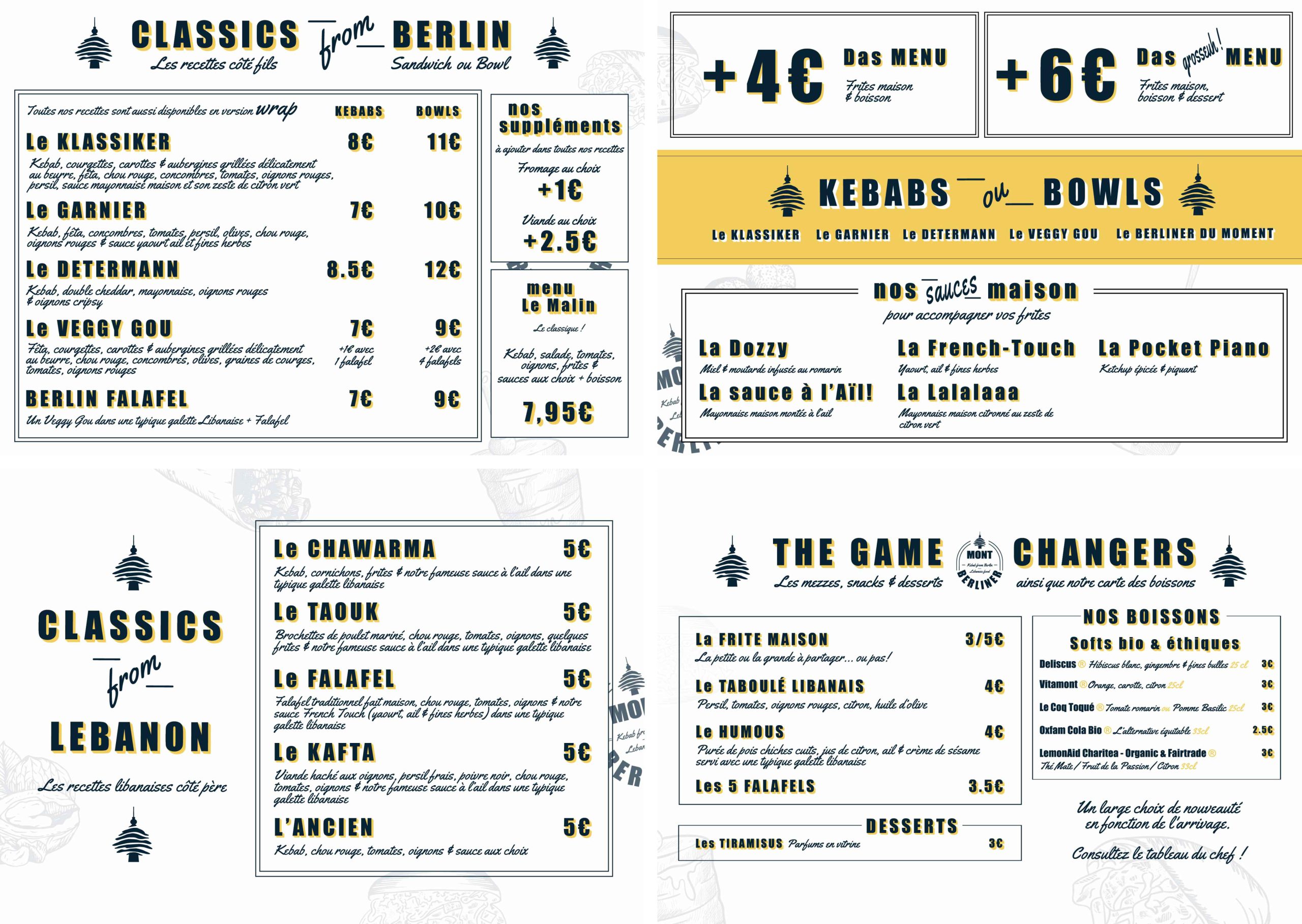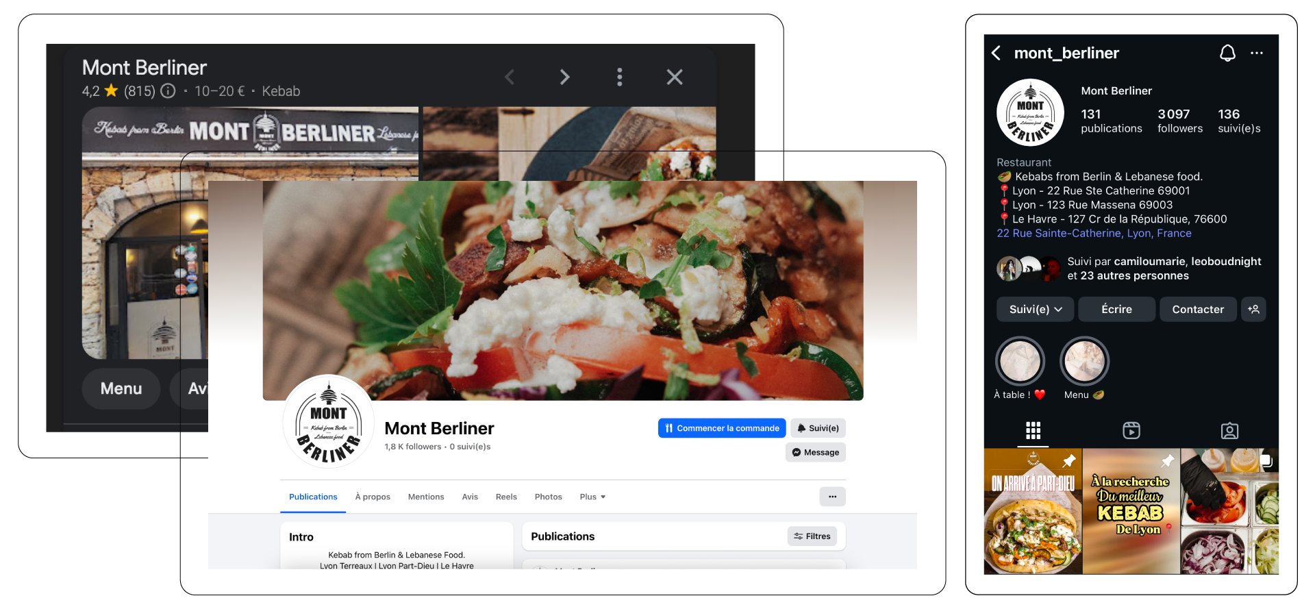 Le Mont Berliner revisite le kebab berlinois avec une approche gastronomique et saine : viandes sourcées, sauces maison, pain travaillé, options veggie, et une exécution rapide sans compromis sur la qualité. L’objectif : poser une image haut de gamme tout en restant accessible, et convertir en visites en restaurant / commandes.
